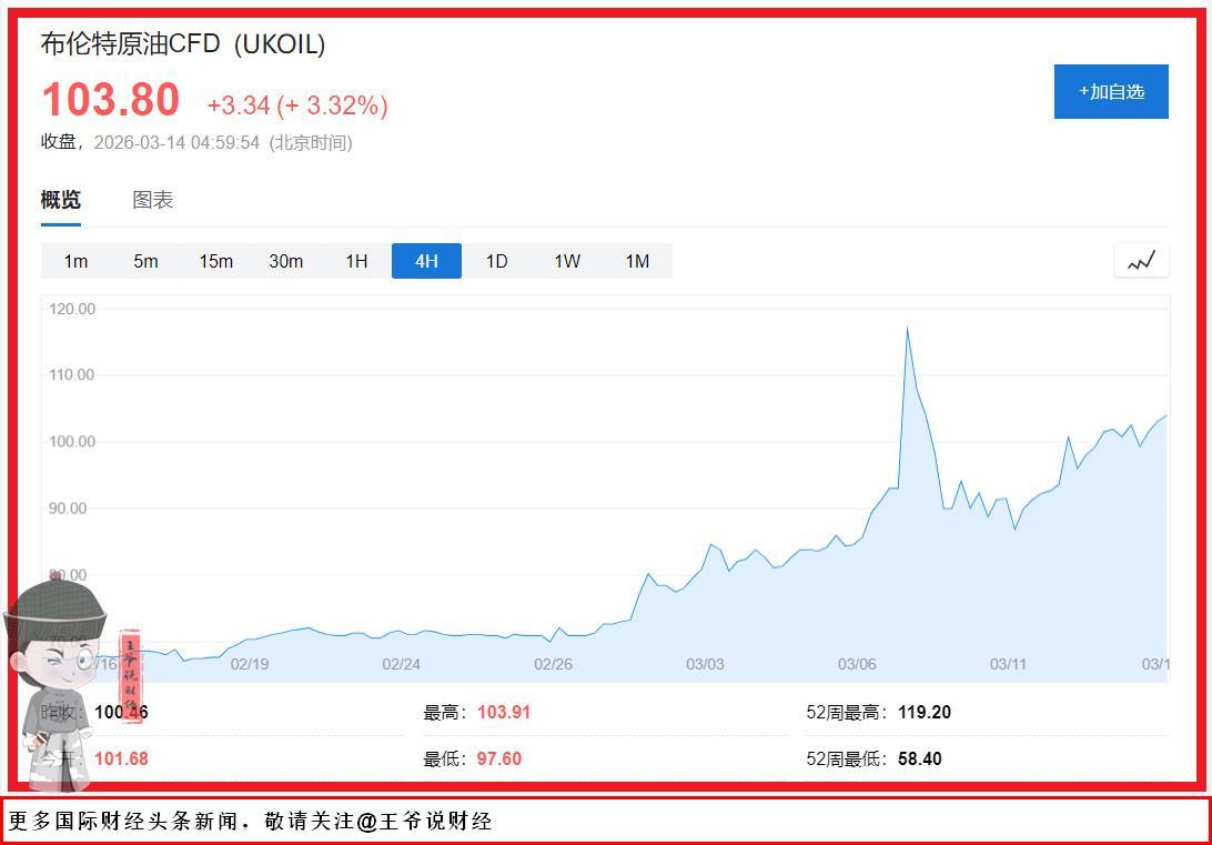 最近国际油价彻底开启狂飙模式,而截止3月13日收盘,布伦特原油收盘价103.8美元,再次冲破100美元整数关口,创下近两年以来的新高。