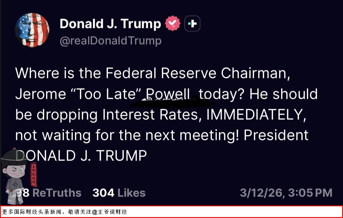 王爷说财经讯:油价狂飙重返100美元后,特朗普急了:再次催促美联储立刻降息!市场却反向押注?